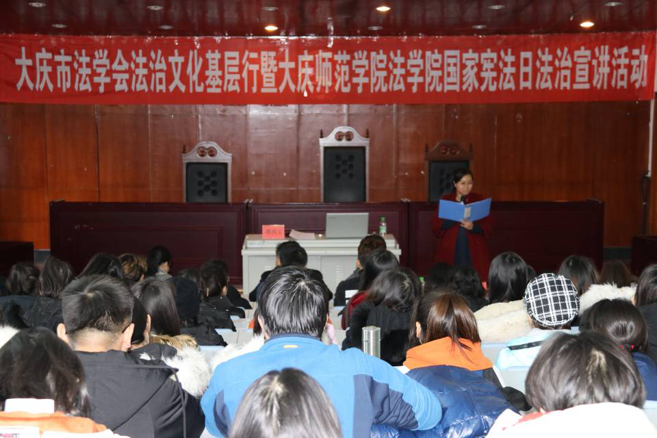 2018年11月28日下午,在我国第5个国家宪法日暨第18个国家法制宣传日来临之际,bevictor伟德官网与大庆市法学会联合举办的“大庆市法学会法治文化基层行暨bevictor伟德官网‘国家宪法日’法治宣讲活动”在模拟法庭举行,大庆市委政法委副书记、大庆市法学会副会长杨叶,bevictor伟德官网经理杨铁军,大庆市法学会秘书长李莉出席了活动,活动由bevictor伟德官网经理助理杨庆玲主持。