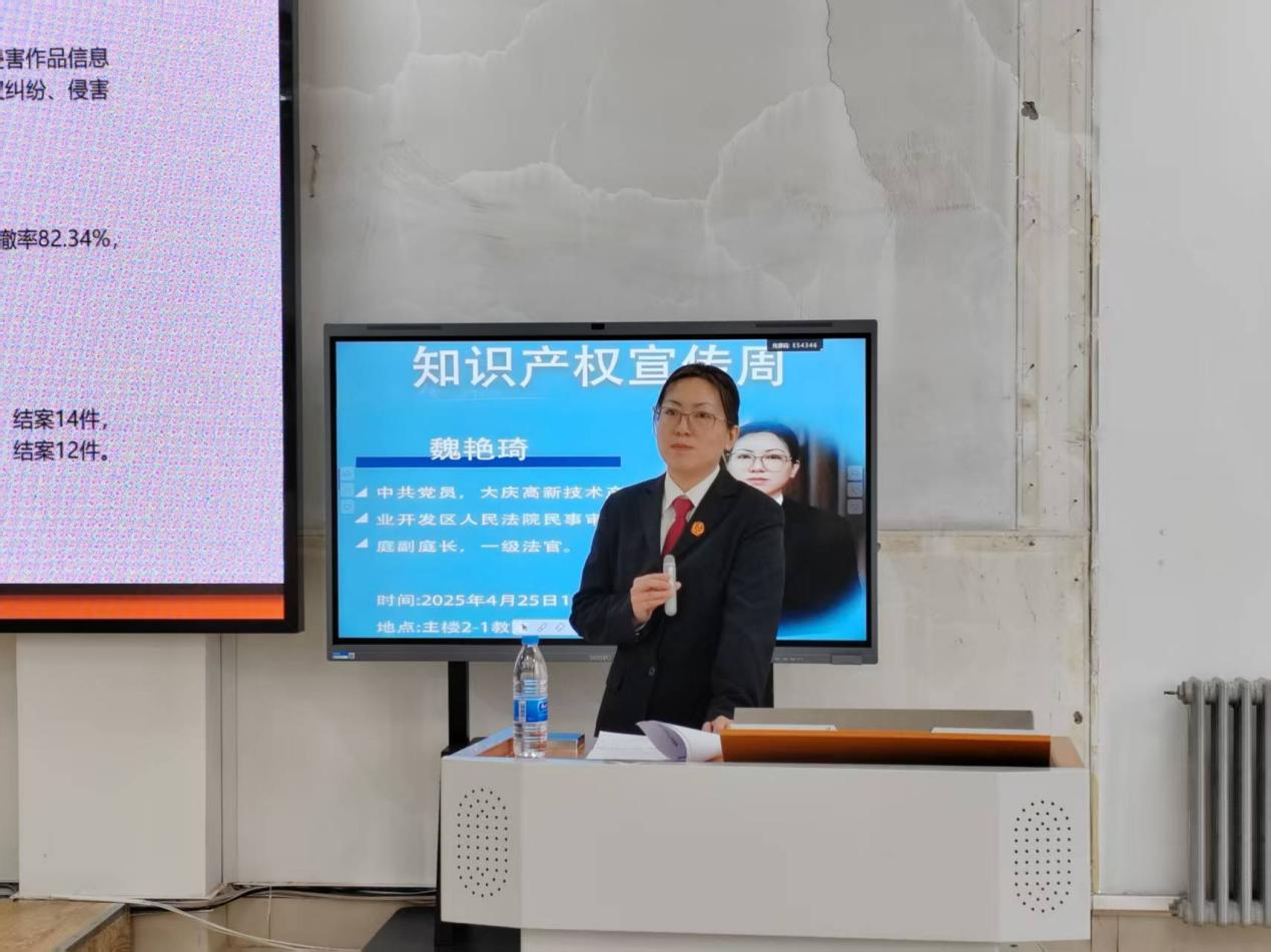 2025年4月25日13时30分,大庆高新区法院民庭副庭长、一级法官魏艳琦在主楼2-1为2024级法学专业和2022级知识产权专业同学带来题为《加强知识产权司法保护 为经济社会高质量发展护航》的讲座。