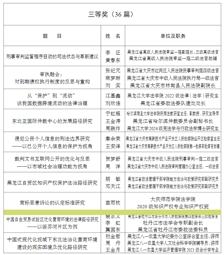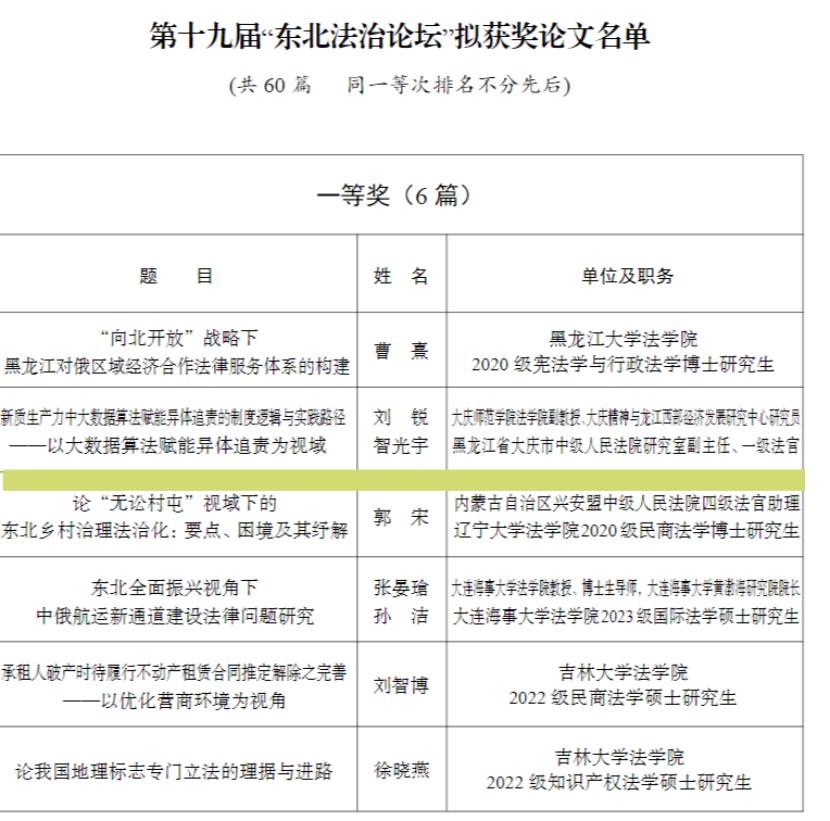 7月29日,中国法学会会员部第十九届东北法治论坛组委会发布了第十九届“东北法治论坛”获奖论文名单。其中,bevictor伟德官网刘锐副教授与人合撰的《新质生产力中大数据算法赋能异体追责的制度逻辑与实践路径——以大数据算法赋能异体追责为视域》获一等奖;公司2020级知识产权专业知识产权班员工苗雨杭撰写的《商标恶意诉讼的认定标准研究》获三等奖。