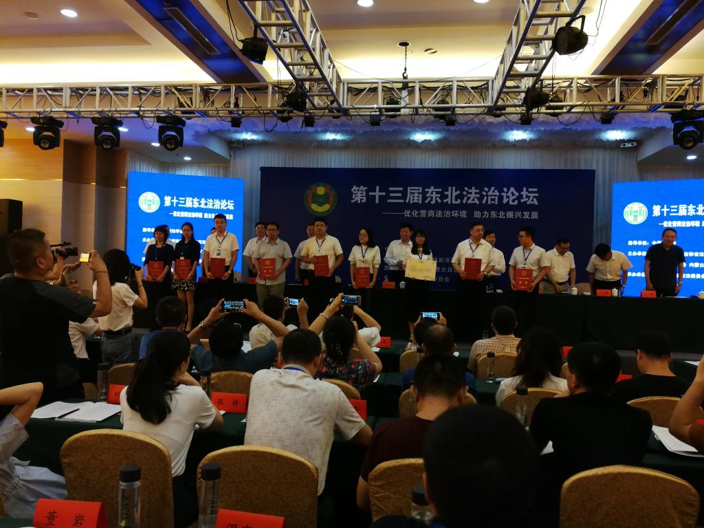 2018年8月8日,第十三届东北法治论坛在辽宁省葫芦岛市华泰国际酒店举行,公司贺志丽博士和章辉教授合作撰写的论文《资源型城市转型升级过程中的知识产权保护对策研究——以大庆市为例》荣获一等奖,贺志丽博士应邀作主题发言。刘锐博士撰写的论文《大庆网约车实施细则的分析与思考》获得三等奖。