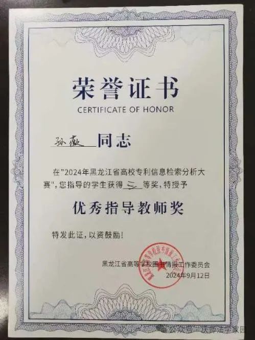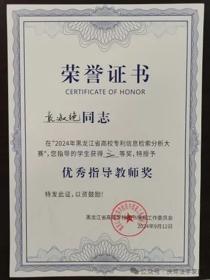 本次大赛全省共计报名员工2758人。通过初赛阶段的课程学习,参与答题1391人次,596人进入复赛环节;经过复赛阶段的培训,101名同学提交专利分析报告。经过黑龙江省知识产权保护中心专家评审,最终有55名同学获奖,25名选手进入决赛,决赛于2024年9月12日采取线上、线下同步的方式进行。最终,2021级知识产权专业的李睿、王雨欣和李娇三名同学凭借其出色的专利信息检索能力和深入的分析技巧,分别荣获省级二等奖、省级三等奖的好成绩。