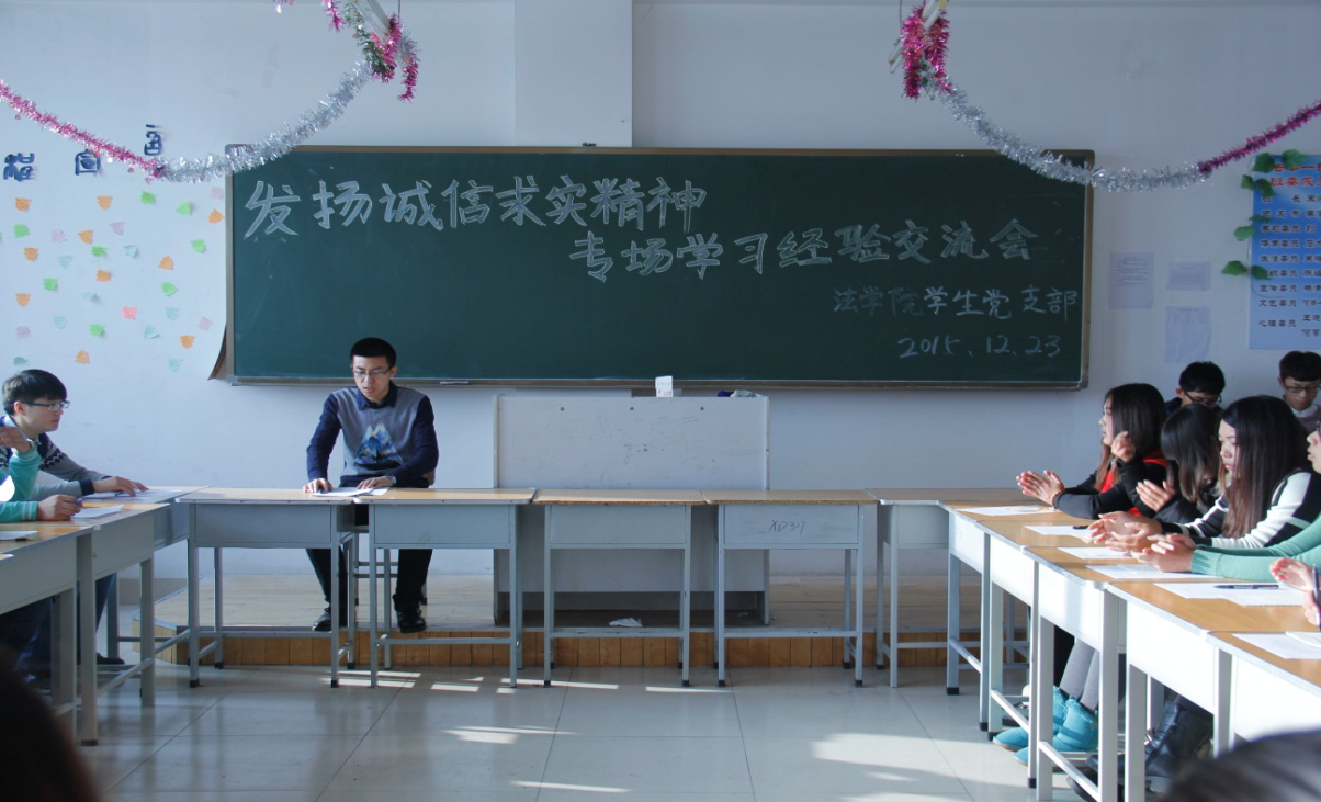 今日,公司员工党支部书记吴树春老师组织本院员工党员及部分积极分子开展了一次以“发扬诚信求实精神”为主题的专场学习交流会。首先,吴老师就本院2012级大四员工的司法考试情况向其余年级的同学进行说明,在法学卓越人才培养班建设方面向同学们提出期望,希望在座的党员,积极分子做好带头学习的榜样,争先创优。其次,由本院2014级成绩优越的三位同学为在座各位分享自己的学习经验,使我们在学习方法的掌握方面有了新的感悟,尤其对2015级初入法学大门的新生来说,具有极大的指导意义,综合来说,本次交流会达到了既定目标,取得了圆满成功!