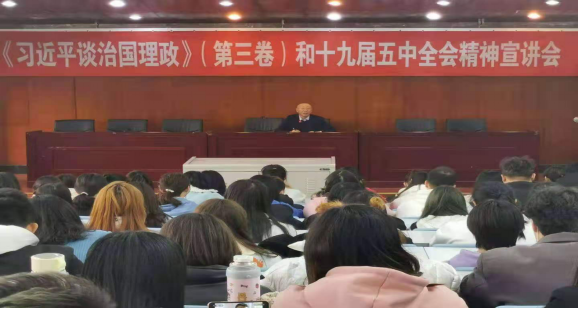 宣讲分两部分内容进行,一是对《习近平谈治国理政》(第三卷)中关于“坚持以人民为中心”的思想进行了详细深刻的解读,二是深入宣讲了党的十九届五中全会审议通过的《中共中央关于制定国民经济和社会发展第十四个五年规划和二0三五年远景目标的建议》(以下简称《建议》)的主要内容即“十三五”时期我国发展取得决定性成就、我国进入新发展阶段的重大意义和重要特征、二0三五年基本实现社会主义现代化远景目标和”十四五“时期经济社会发展主要目标等。与会同学认真聆听,会场秩序良好。会后,同学们纷纷表示,聆听宣讲,进一步增进了对习近平新时代中国特色社会主义思想的理解。《建议》描绘了我国未来一个时期的发展蓝图,对我们国家下步发展目标更加清晰明确,对国家发展更有信心,学习工作更有动力。