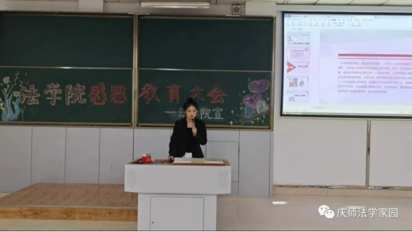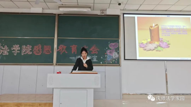 王誉航同学通过具体事例向同学们讲述心怀感恩的意义。她号召受过资助的同学们在学习和生活中,要发挥模范带头作用,处处都要率先垂范,不断引领同学们树立自立自强、知恩图报、勇于担当的良好品质。
