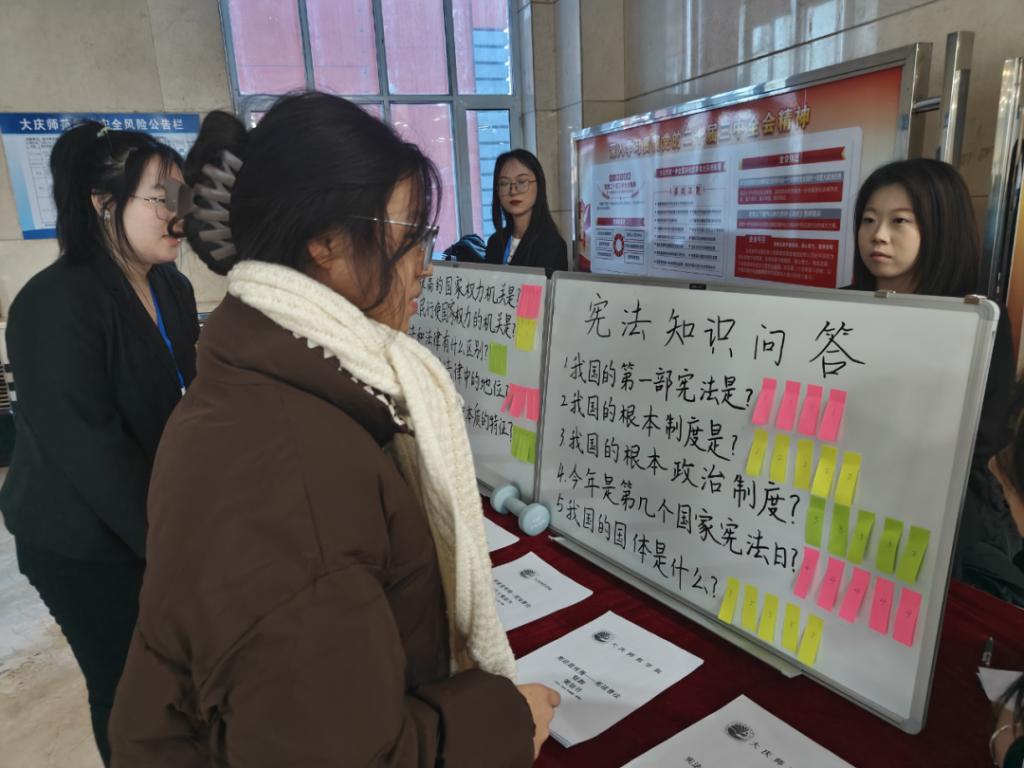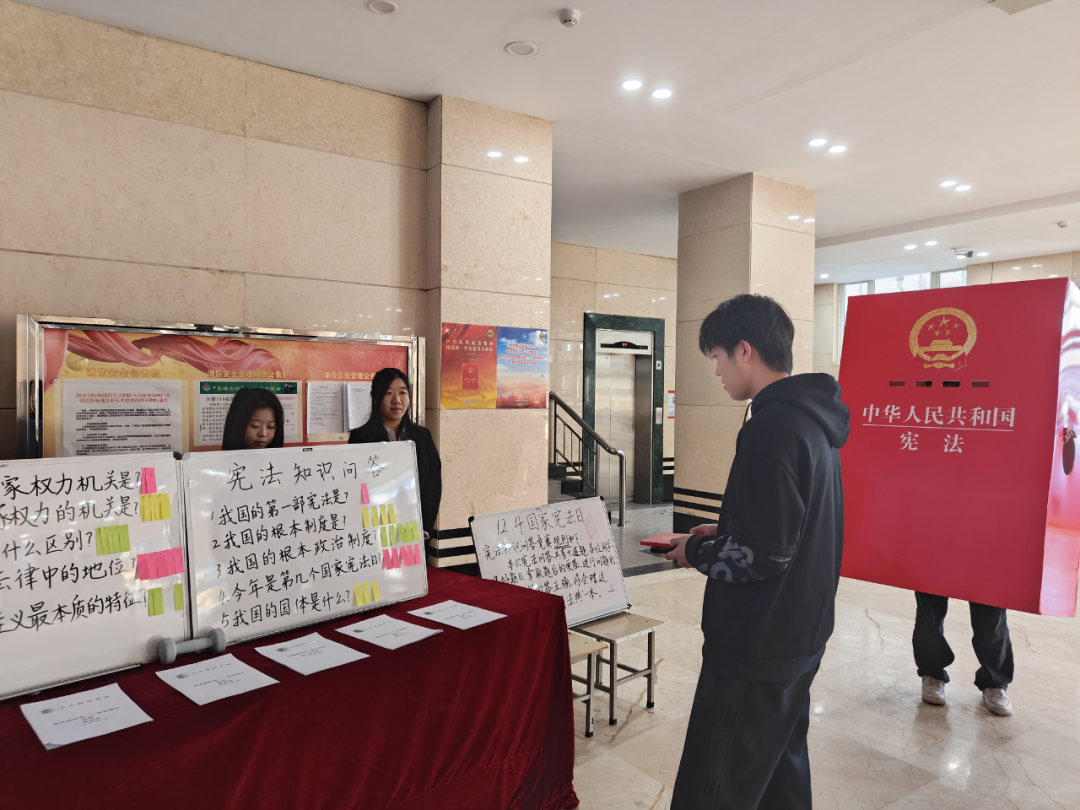 2024年12月4日是第11个国家宪法日。为响应国家关于“12·4”宪法日“大力弘扬宪法精神,推动进一步全面深化改革”的积极号召,引导全校师生加深对宪法认识和了解,弘扬宪法精神,树立宪法权威,共建法治校园。12月4日,由黑龙江省法学会指导,大庆市法学会、大庆市老员工普法志愿者联盟、共青团bevictor伟德官网委员会主办,大庆市老员工普法志愿者联盟bevictor伟德官网分部、bevictor伟德官网纵横辩论社、bevictor伟德官网知产维度社团共同承办的宪法知识问答主题活动在主楼中厅顺利举行。