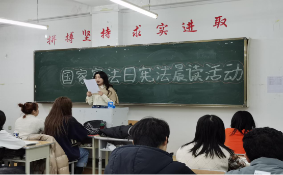 在“宪法宣传周”活动中,各年级、同学们积极参与,认真学习宪法知识,宣传宪法精神,采取统一诵读的方式,共同学习领会宪法内涵。由各班的团支书领读宪法部分条款,同学跟读。大家踊跃参与,加深了对宪法的认识。